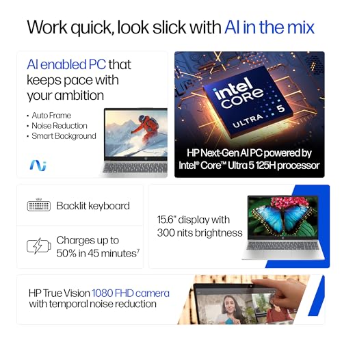HP 15, Intel Ultra 5 125H, 12 Tops (16GB DDR5, 512GB SSD) FHD, IPS, 15.6”/39.6cm, Win11, M365 Basic(1yr)* Office24, Silver, 1.65kg, fd1254TU, Intel Graphics, FHD Camera w/Shutter, AI Powered Laptop
