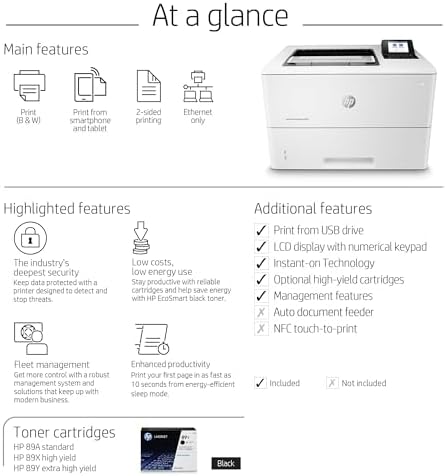 | Included Components | HP LaserJet Enterprise M507 Printer; Regulatory flyer (CD replacement); Unpack Flyer; Installation Guide; Power cord; Warranty Cards; Support flyers/number list |